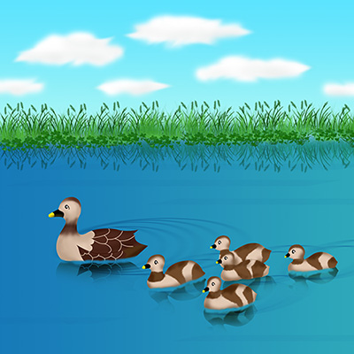 親どりの愛情と子ガモの愛らしさに気を遣って描きました。水草やカルガモの反射、波紋を描いて、水面の雰囲気が伝わるようにしました。 雲の描写は、縁をぼかして綿のような柔らかい雰囲気を心がけました。