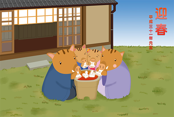 2019年イノシシ年の年賀状です。 お庭で七輪で焼いたお餅を食べて、お正月をお祝いするイノシシの家族を優しい雰囲気で描きました。