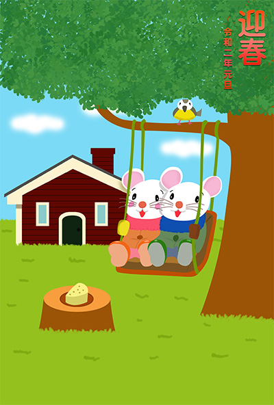 2020年ネズミ年の年賀状です。 暖かい恰好をして、木に吊り下げられたブランコに一緒に座って楽しそうに過ごすネズミのカップルを愛情込めて描きました。