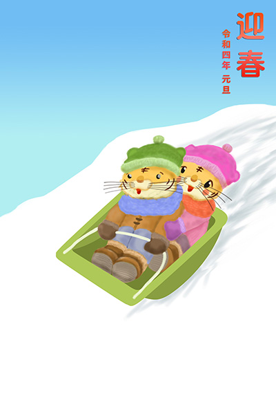 2022年トラ年の年賀状です。 雪山を橇で楽しそうに滑走するトラのカップルを愛情込めて描きました。