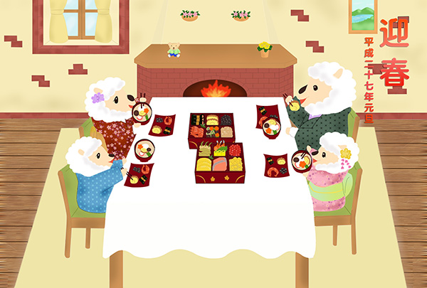 2015年ヒツジ年の年賀状です。 ヒツジの家族がみんなで仲良くおせち料理を楽しむ光景を愛情込めて描きました。