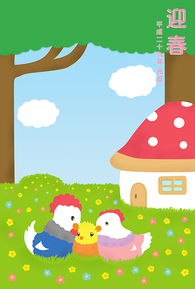 2017年トリ年の年賀状です。 愛情に包まれたニワトリの家族を優しい雰囲気で描きました。